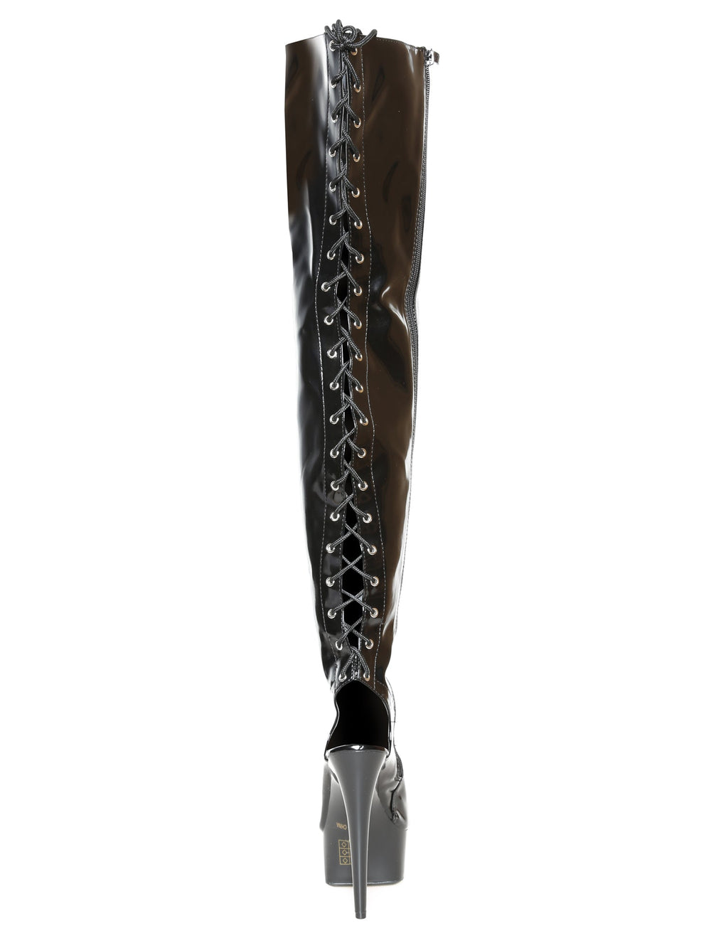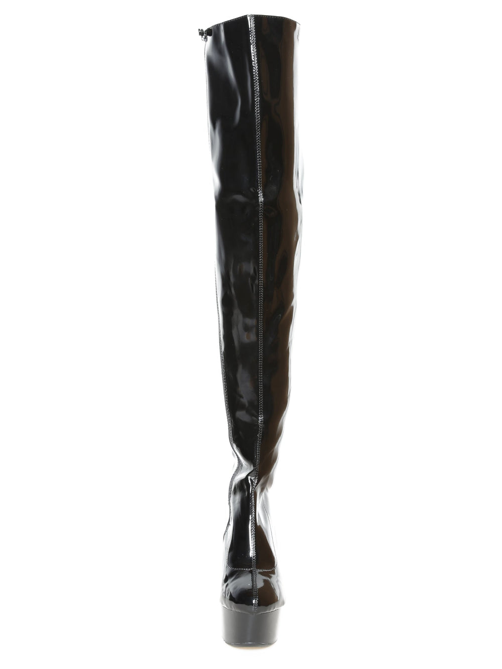 The boot sits at the thigh height. A general rule of thumb would see a shaft height of 19 inches (38 cm) or more for this style of boot.